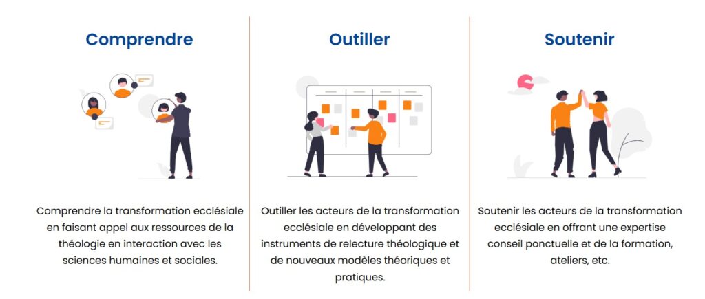 - Outiller les acteurs de la transformation ecclésiale, en développant des outils pratiques de relecture, d’analyse, d’évaluation et de discernement ainsi que des méthodologies opérationnelles pour aborder les transformations